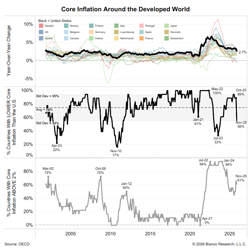 The middle panel shows that the U.S. has higher core inflation than 56% of the countries shown. Note this was 89% in October. The decline could be attributed to the U.S. government shutdown, which led to no October data, and to the government statistical mills assuming zero. In other words, the recent drop is based on questionable assumptions.