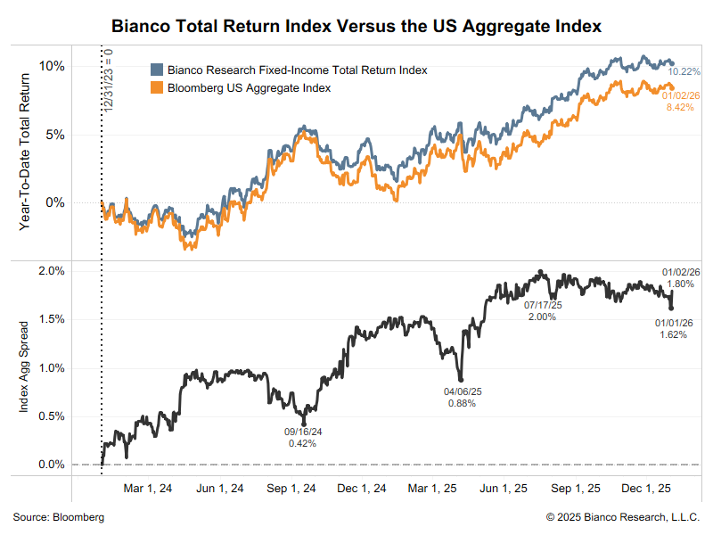 Since August 2023, we have been managing the Bianco Research Total Return Index (Bloomberg: BTRINDX). We manage this index at our discretion to outperform the typical fixed-income benchmark. In December 2023, our partners at WisdomTree started an ETF that tracks our index (Symbol: WTBN).