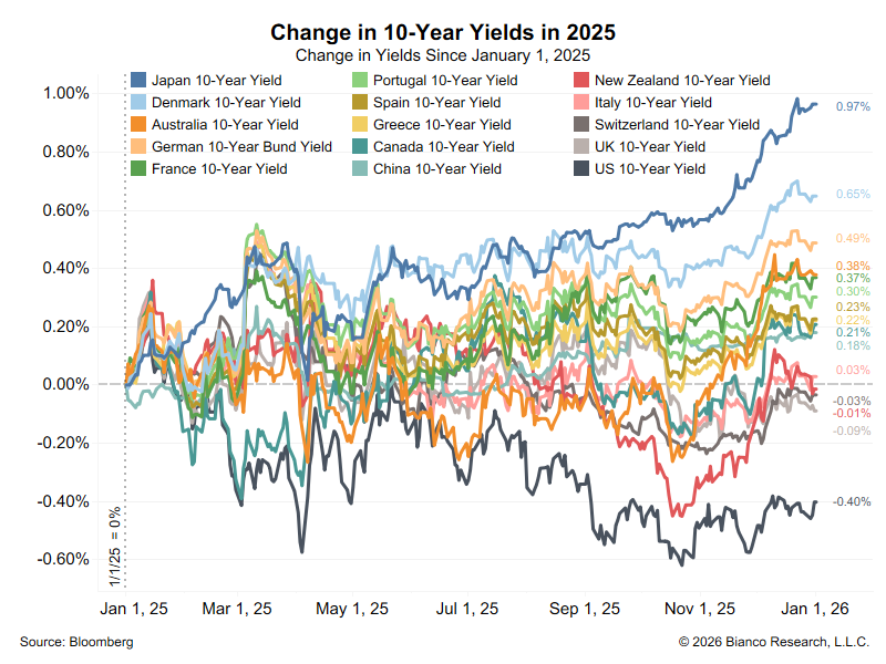 The chart below shows the change in 10-year yields in 2025 for the 15 largest bond markets.