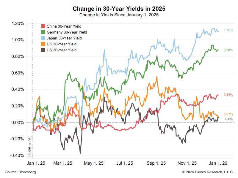 Not every country issues a 30-year bond. Those that do saw higher or unchanged yields on the year, including the U.S. (black).