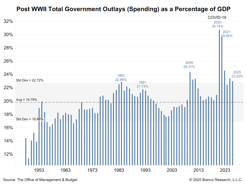 2025 finished with government spending accounting for 23% of GDP. Since the end of World War II, only 2009 (the financial crisis) and 2020/2021 (COVID) have seen government spending account for a larger share of GDP. Again, the government is spending as if the country were in a recession, even though it is not.