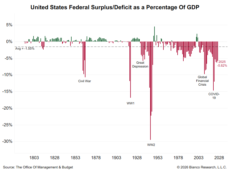 In fiscal 2025 (the U.S. fiscal year ends in September), the U.S. deficit was 5.82% of GDP, the lowest level since 2019. Note that the only other time the deficit was lower relative to GDP was during the Civil War, WW I, the Great Depression, WW II, the 2008 financial crisis, and COVID-19. In other words, this is the biggest non-war or crisis deficit in American history.