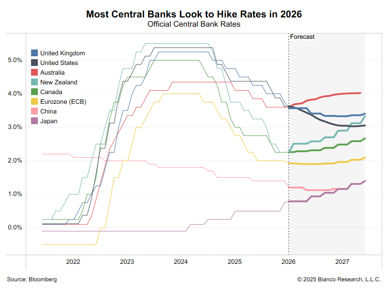 • Central banks of five of the eight countries are expected to hike rates in 2026 (Japan in purple, ECB in yellow, Canada in green, New Zealand in cyan, and Australia in red)