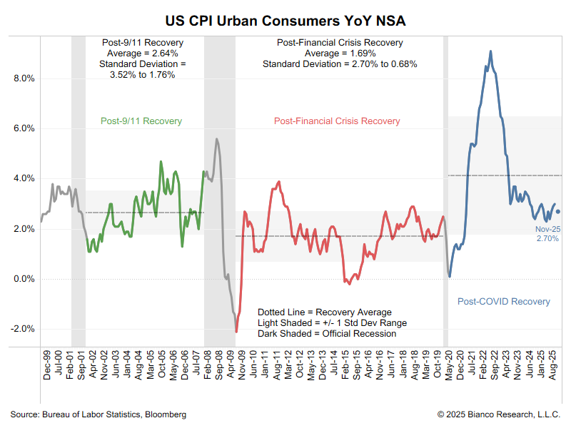 The following chart isolates headline CPI in the United States. It is color-coded to distinguish inflation in the post-COVID recovery (blue), the post-financial crisis recovery (red), and the post-9/11 recovery (green). The current headline inflation rate of 2.7% is still higher than in most periods of the previous recovery (red) and above the average inflation rate during the previous recovery (green).
