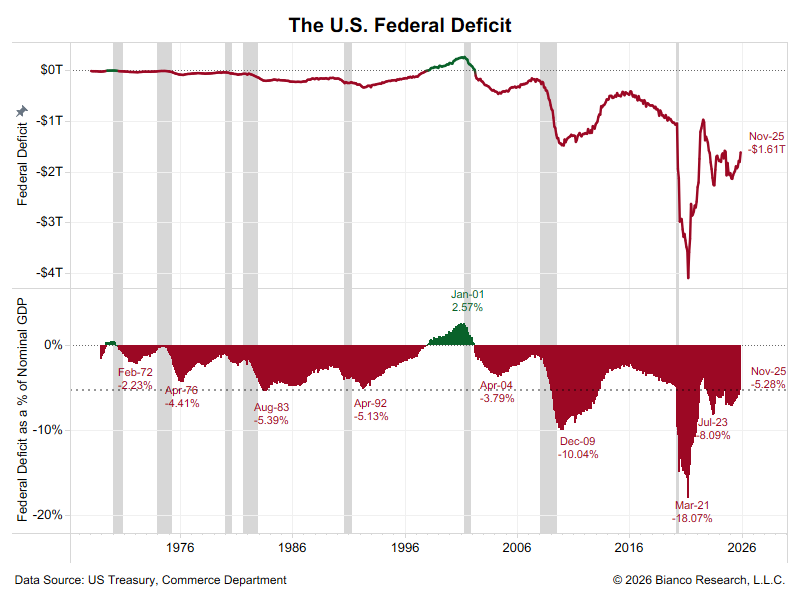 The top panel below shows that the U.S. federal deficit was $1.61 trillion as of November (latest data). The bottom shows this as a percentage of GDP. The current deficit of 5.28% of GDP is larger than any of the recessions from the 1970s to 1990s.