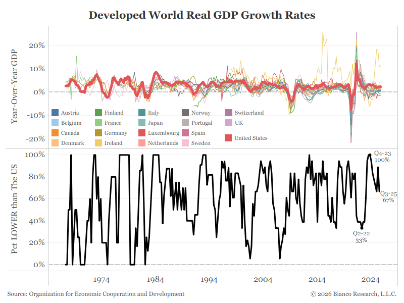 The bottom panel shows that as of Q3 2025 (latest data) the U.S. had higher real GDP growth than 67% of the countries listed. Note that as recently as Q4 2024, the U.S. had the highest real GDP among these developed countries. The U.S. does not have weak growth relative to the rest of the world.